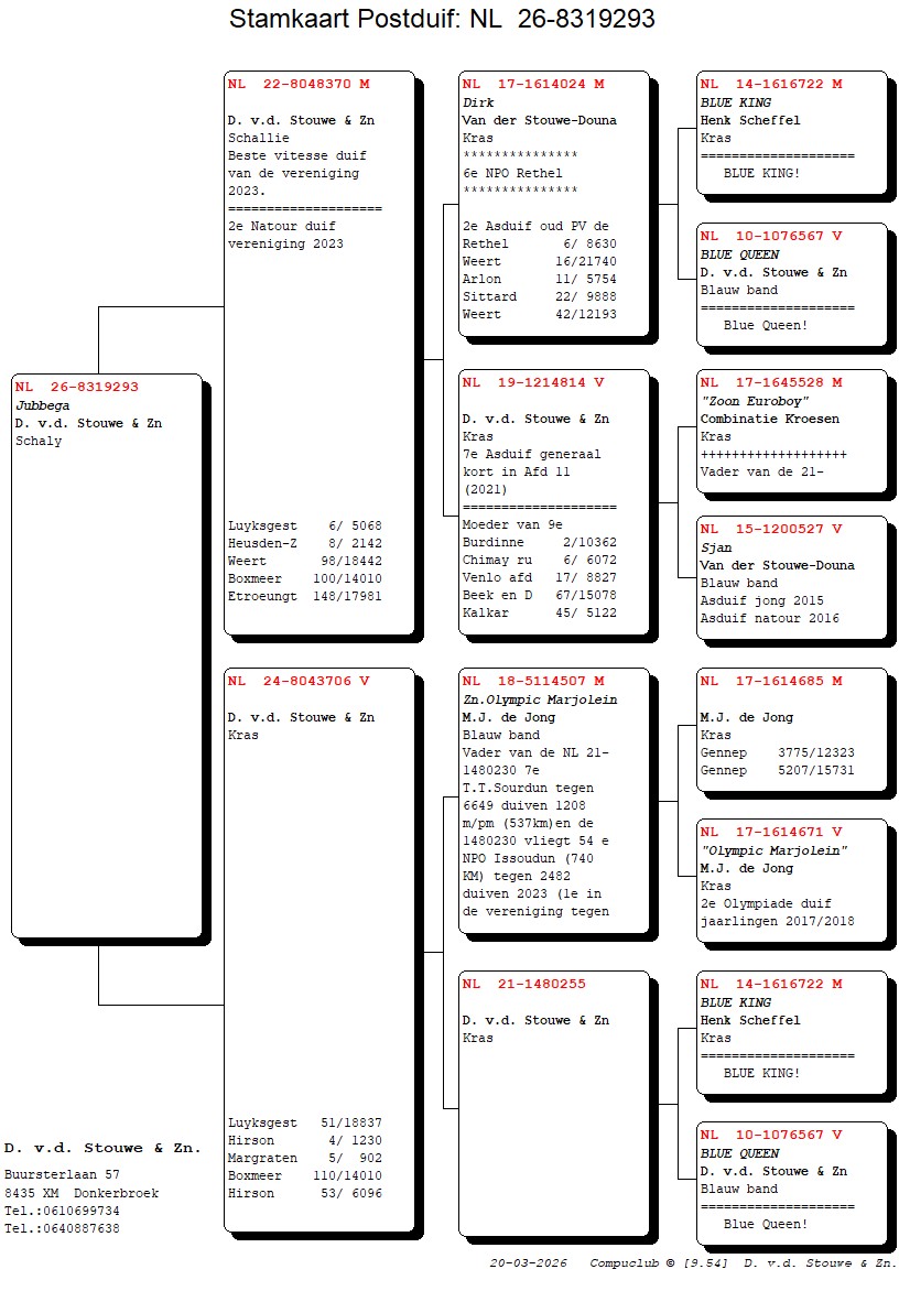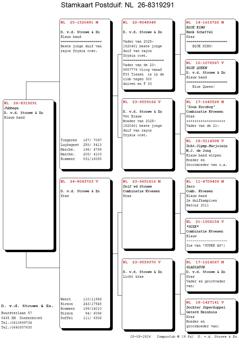 Op de Midfond werden ze 2e Onaangewezen van Afdeling Friesland’96. Daarnaast ook nog 3e Generaal Lang van de gehele Afdeling. Op de Dagfond ook vaak in het snuitje van de uitslag terug te vinden. Een echt allround hok! Het belangrijkste koppel op het hok is “Blue King” x “Blue Queen”. Inmiddels zitten ook al meerdere kinderen van dit unieke koppel op het kweekhok.